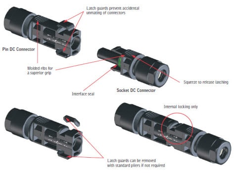 The SolarSpec™ DC Connectors from Molex provide a secure IP-67 sealed connection for series cabling of silicon photovoltaic (PV) panels through industry-standard pin and socket construction, easy 'snap-lock' mating, and an internal locking mechanism. The SolarSpec™ DC Connectors have Molex's exclusive design features including molded surface ribs for a secure grip, "touch-proof" safety construction to protect against an electrical current whether the connectors are mated or unmated, and a contact resistance of <0.5mΩ. The rugged design of the Molex SolarSpec™ DC Connectors meets NEC 2008 and NFPA 70; US-code for "the safe installation of electrical wiring and equipment" and the TÜV and UL dual-qualification for long-life in harsh conditions. The connectors are suitable for 14, and 12 to 10 AWG cable.