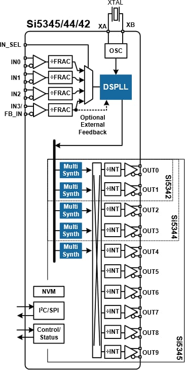 Skyworks Solutions Inc. Si534x/Si538x clock devices are designed to meet the exacting specifications and high-performance requirements of Internet Infrastructure. These ultra-low-jitter clock devices reduce cost and complexity for a wide range of timing applications. Skyworks Si534x/Si538x clock devices provide fast, free and easy customization for any frequency on any output with no compromise on performance or specifications. This includes any frequency up to 800MHz with 0ppm frequency synthesis, across 4 inputs and 10 outputs with any voltage and phase jitter as low as 100fs(RMS). Skyworks clocks enable a true "clock tree on-chip" solution.Features